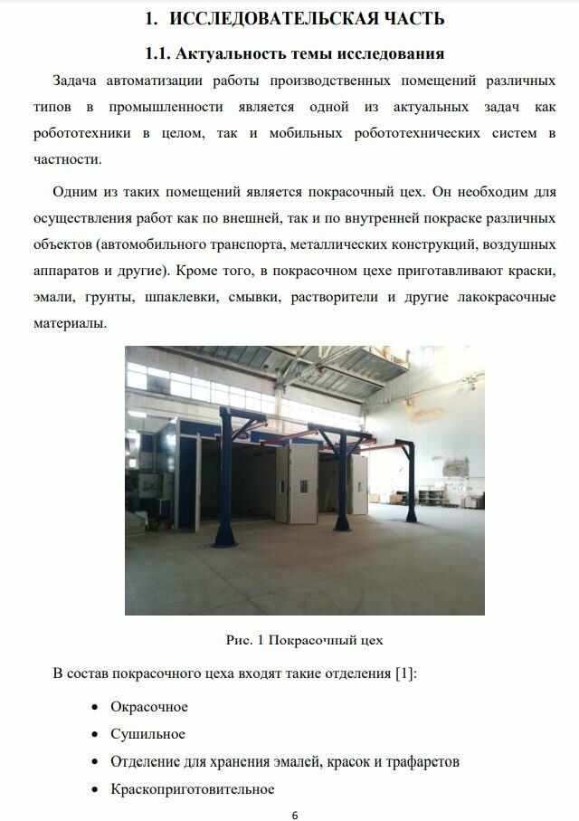 1.1. Актуальность темы исследования Задача автоматизации работы производственных помещений различных типов в промышленности является одной из актуальных задач как робототехники в целом, так и мобильных робототехнических систем в частности. Одним из таких помещений является покрасочный цех. Он необходим для осуществления работ как по внешней, так и по внутренней покраске различных объектов (автомобильного транспорта, металлических конструкций, воздушных аппаратов и другие). Кроме того, в покрасочном цехе приготавливают краски, эмали, грунты, шпаклевки, смывки, растворители и другие лакокрасочные материалыВ состав покрасочного цеха входят такие отделения [1]: • Окрасочное • Сушильное • Отделение для хранения эмалей, красок и трафаретов • Краскоприготовительное