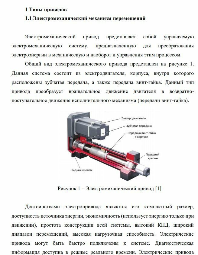 Электромеханический привод представляет собой управляемую электромеханическую систему, предназначенную для преобразования электроэнергии в механическую и наоборот и управления этим процессом. Общий вид электромеханического привода представлен на рисунке 1. Данная система состоит из электродвигателя, корпуса, внутри которого расположены зубчатая передача, а также передача винт-гайка. Данный тип привода преобразует вращательное движение двигателя в возвратнопоступательное движение исполнительного механизма (передачи винт-гайка).