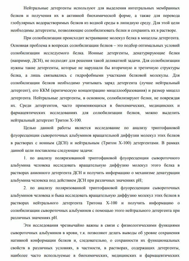 Нейтральные детергенты используют для выделения интегральных мембранных белков и получения их в активной биохимической форме, а также для перевода глобулярных водорастворимых белков из водной среды в липидную среду. Для этой цели необходимы детергенты, позволяющие солюбилизовать белки и сохранить их в растворе. При солюбилизации происходит встраивание молекул белка в мицеллы детергента. Основная проблема в вопросах солюбилизации белков – это подбор оптимальных условий солюбилизации исследуемого белка. Ионные детергенты, денатурирующие белки (например, ДСН), не подходят для решения такой деликатной задачи. Для солюбилизации нужны такие детергенты, которые не нарушали бы вторичную и третичную структуры белка, а лишь связывались с гидрофобными участками белковой молекулы. Для солюбилизации белков необходимо учитывать заряд детергента (лучше нейтральный детергент), его ККМ (критическую концентрацию мицеллообразования) и размер мицелл детергента. Нейтральные детергенты, в основном, солюбилизируют белки, не повреждая их. Среди детергентов, часто применяющихся в биохимических, медицинских и фармацевтических исследованиях для солюбилизации белков, можно выделить нейтральный детергент Тритон Х-100. Целью данной работы является исследование по анализу триптофановой флуоресценции сывороточных альбуминов вращательной диффузии молекул этих белков в растворах с ионным (ДСН) и нейтральным (Тритон Х-100) детергентами. В рамках данной цели поставлены следующие задачи: 1. по анализу поляризованной триптофановой флуоресценции сывороточного альбумина человека исследовать вращательную диффузию молекул этого белка в растворах анионного детергента ДСН и получить информацию о механизме денатурации альбумина человека под действием ДСН при различных значениях pH; 2. по анализу поляризованной триптофановой флуоресценции сывороточных альбуминов человека и быка исследовать вращательную диффузию молекул этих белков в растворах нейтрального детергента Тритона Х-100 и получить информацию о солюбилизации сывороточных альбуминов с помощью этого нейтрального детергента при различных значениях pH. Эти исследования чрезвычайно важны в связи с физиологическими функциями сывороточных альбуминов в крови, т.к. позволяют делать выводы об уровне сохранения нативной конформации белков и, следовательно, о сохранности их функциональных свойств в различных условиях, в частности, в растворах, содержащих детергенты, наиболее часто используемые в биохимических, медицинских и фармацевтических задачах.