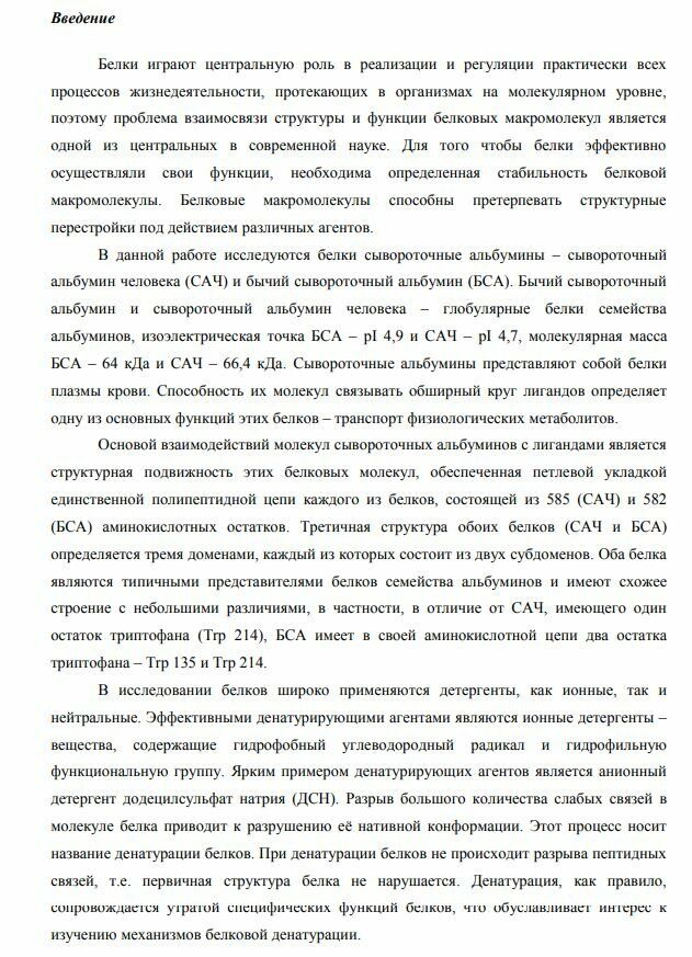 Белки играют центральную роль в реализации и регуляции практически всех процессов жизнедеятельности, протекающих в организмах на молекулярном уровне, поэтому проблема взаимосвязи структуры и функции белковых макромолекул является одной из центральных в современной науке. Для того чтобы белки эффективно осуществляли свои функции, необходима определенная стабильность белковой макромолекулы. Белковые макромолекулы способны претерпевать структурные перестройки под действием различных агентов. В данной работе исследуются белки сывороточные альбумины – сывороточный альбумин человека (САЧ) и бычий сывороточный альбумин (БСА). Бычий сывороточный альбумин и сывороточный альбумин человека – глобулярные белки семейства альбуминов, изоэлектрическая точка БСА – pI 4,9 и САЧ – pI 4,7, молекулярная масса БСА – 64 кДа и САЧ – 66,4 кДа. Сывороточные альбумины представляют собой белки плазмы крови. Способность их молекул связывать обширный круг лигандов определяет одну из основных функций этих белков – транспорт физиологических метаболитов. Основой взаимодействий молекул сывороточных альбуминов с лигандами является структурная подвижность этих белковых молекул, обеспеченная петлевой укладкой единственной полипептидной цепи каждого из белков, состоящей из 585 (САЧ) и 582 (БСА) аминокислотных остатков. Третичная структура обоих белков (САЧ и БСА) определяется тремя доменами, каждый из которых состоит из двух субдоменов. Оба белка являются типичными представителями белков семейства альбуминов и имеют схожее строение с небольшими различиями, в частности, в отличие от САЧ, имеющего один остаток триптофана (Trp 214), БСА имеет в своей аминокислотной цепи два остатка триптофана – Trp 135 и Trp 214. В исследовании белков широко применяются детергенты, как ионные, так и нейтральные. Эффективными денатурирующими агентами являются ионные детергенты – вещества, содержащие гидрофобный углеводородный радикал и гидрофильную функциональную группу. Ярким примером денатурирующих агентов является анионный детергент додецилсульфат натрия (ДСН). Разрыв большого количества слабых связей в молекуле белка приводит к разрушению её нативной конформации. Этот процесс носит название денатурации белков. При денатурации белков не происходит разрыва пептидных связей, т.е. первичная структура белка не нарушается. Денатурация, как правило, сопровождается утратой специфических функций белков, что обуславливает интерес к изучению механизмов белковой денатурации.