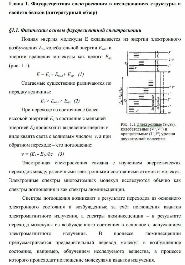 Глава 1. Флуоресцентная спектроскопия в исследованиях структуры и свойств белков (литературный обзор) §1.1. Физические основы флуоресцентной спектроскопии Полная энергия молекулы E складывается из энергии электронного возбуждения Eэ , колебательной энергии Eкол и энергии вращения молекулы как целого Eвр (рис. 1.1):