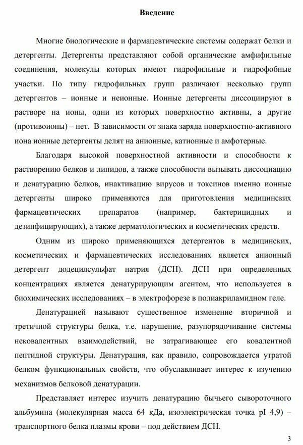 Многие биологические и фармацевтические системы содержат белки и детергенты. Детергенты представляют собой органические амфифильные соединения, молекулы которых имеют гидрофильные и гидрофобные участки. По типу гидрофильных групп различают несколько групп детергентов – ионные и неионные. Ионные детергенты диссоциируют в растворе на ионы, одни из которых поверхностно активны, а другие (противоионы) – нет. В зависимости от знака заряда поверхностно-активного иона ионные детергенты делят на анионные, катионные и амфотерные. Благодаря высокой поверхностной активности и способности к растворению белков и липидов, а также способности вызывать диссоциацию и денатурацию белков, инактивацию вирусов и токсинов именно ионные детергенты широко применяются для приготовления медицинских фармацевтических препаратов (например, бактерицидных и дезинфицирующих), а также дерматологических и косметических средств. Одним из широко применяющихся детергентов в медицинских, косметических и фармацевтических исследованиях является анионный детергент додецилсульфат натрия (ДСН). ДСН при определенных концентрациях является денатурирующим агентом, что используется в биохимических исследованиях – в электрофорезе в полиакриламидном геле. Денатурацией называют существенное изменение вторичной и третичной структуры белка, т.е. нарушение, разупорядочивание системы нековалентных взаимодействий, не затрагивающее его ковалентной пептидной структуры. Денатурация, как правило, сопровождается утратой белком функциональных свойств, что обуславливает интерес к изучению механизмов белковой денатурации.