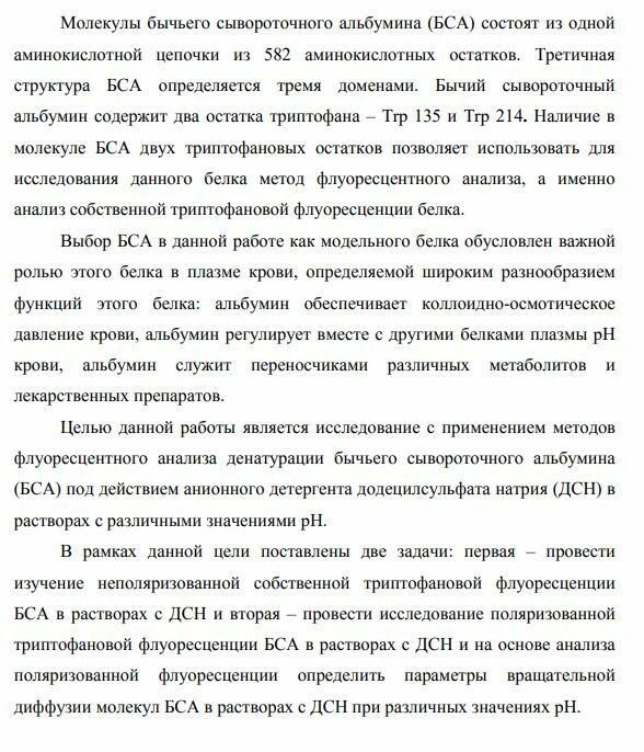 Представляет интерес изучить денатурацию бычьего сывороточного альбумина (молекулярная масса 64 кДа, изоэлектрическая точка pI 4,9) – транспортного белка плазмы крови – под действием ДСН. 4 Молекулы бычьего сывороточного альбумина (БСА) состоят из одной аминокислотной цепочки из 582 аминокислотных остатков. Третичная структура БСА определяется тремя доменами. Бычий сывороточный альбумин содержит два остатка триптофана – Trp 135 и Trp 214. Наличие в молекуле БСА двух триптофановых остатков позволяет использовать для исследования данного белка метод флуоресцентного анализа, а именно анализ собственной триптофановой флуоресценции белка. Выбор БСА в данной работе как модельного белка обусловлен важной ролью этого белка в плазме крови, определяемой широким разнообразием функций этого белка: альбумин обеспечивает коллоидно-осмотическое давление крови, альбумин регулирует вместе с другими белками плазмы pH крови, альбумин служит переносчиками различных метаболитов и лекарственных препаратов. Целью данной работы является исследование с применением методов флуоресцентного анализа денатурации бычьего сывороточного альбумина (БСА) под действием анионного детергента додецилсульфата натрия (ДСН) в растворах с различными значениями pH. В рамках данной цели поставлены две задачи: первая – провести изучение неполяризованной собственной триптофановой флуоресценции БСА в растворах с ДСН и вторая – провести исследование поляризованной триптофановой флуоресценции БСА в растворах с ДСН и на основе анализа поляризованной флуоресценции определить параметры вращательной диффузии молекул БСА в растворах с ДСН при различных значениях pH.