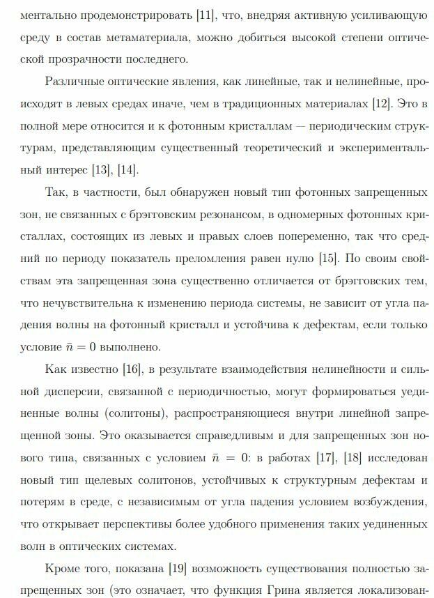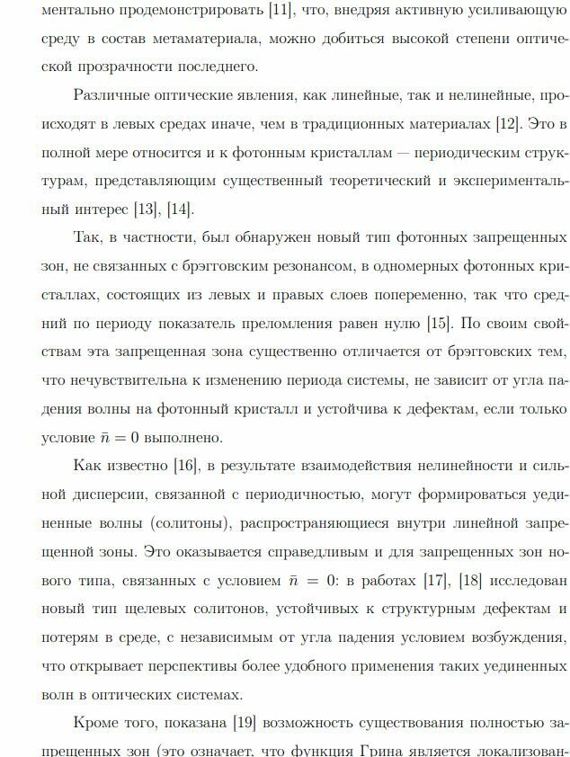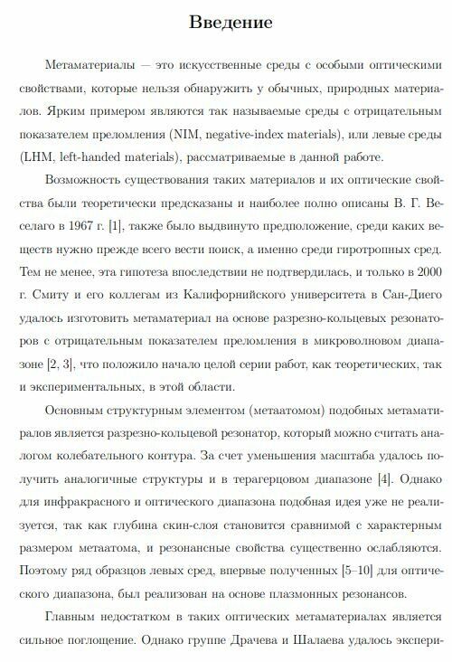 Метаматериалы — это искусственные среды с особыми оптическими свойствами, которые нельзя обнаружить у обычных, природных материалов. Ярким примером являются так называемые среды с отрицательным показателем преломления (NIM, negative-index materials), или левые среды (LHM, left-handed materials), рассматриваемые в данной работе. Возможность существования таких материалов и их оптические свойства были теоретически предсказаны и наиболее полно описаны В. Г. Веселаго в 1967 г. [1], также было выдвинуто предположение, среди каких веществ нужно прежде всего вести поиск, а именно среди гиротропных сред. Тем не менее, эта гипотеза впоследствии не подтвердилась, и только в 2000 г. Смиту и его коллегам из Калифорнийского университета в Сан-Диего удалось изготовить метаматериал на основе разрезно-кольцевых резонаторов с отрицательным показателем преломления в микроволновом диапазоне [2, 3], что положило начало целой серии работ, как теоретических, так и экспериментальных, в этой области. Основным структурным элементом (метаатомом) подобных метаматиралов является разрезно-кольцевой резонатор, который можно считать аналогом колебательного контура. За счет уменьшения масштаба удалось получить аналогичные структуры и в терагерцовом диапазоне [4]. Однако для инфракрасного и оптического диапазона подобная идея уже не реализуется, так как глубина скин-слоя становится сравнимой с характерным размером метаатома, и резонансные свойства существенно ослабляются. Поэтому ряд образцов левых сред, впервые полученных [5–10] для оптического диапазона, был реализован на основе плазмонных резонансов. Главным недостатком в таких оптических метаматериалах является сильное поглощение. Однако группе Драчева и Шалаева удалось экспертментально продемонстрировать [11], что, внедряя активную усиливающую среду в состав метаматериала, можно добиться высокой степени оптической прозрачности последнего. Различные оптические явления, как линейные, так и нелинейные, происходят в левых средах иначе, чем в традиционных материалах [12]. Это в полной мере относится и к фотонным кристаллам — периодическим структурам, представляющим существенный теоретический и экспериментальный интерес [13], [14]. Так, в частности, был обнаружен новый тип фотонных запрещенных зон, не связанных с брэгговским резонансом, в одномерных фотонных кристаллах, состоящих из левых и правых слоев попеременно, так что средний по периоду показатель преломления равен нулю [15]. По своим свойствам эта запрещенная зона существенно отличается от брэгговских тем, что нечувствительна к изменению периода системы, не зависит от угла падения волны на фотонный кристалл и устойчива к дефектам, если только условие