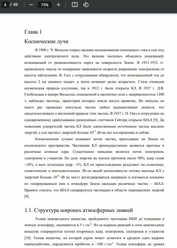 В 1900 г. Ч. Вильсон открыл явление возникновения спонтанного тока в газе под действием электрического поля. Это явление пытались объяснить ионизацией, возникающей от радиоактивности пород на поверхности Земли. В 1911-1912 гг. проводились опыты по измерению зависимости скорости разряжения электроскопа от высоты наблюдения. В. Гесс с сотрудниками обнаружили, что ионизационный ток до высоты 2 км немного падает, а затем начинает резко возрастать. Стала очевидна космическая природа излучения, так в 1912 г. были открыты КЛ. В 1927 г. Д.В. Скобельцын в камере Вильсона, помещенной в магнитное поле с напряженностью 1200 э, наблюдал частицы, траектории которых имели малую кривизну. Их импульс во много раз превышал импульсы частиц любых радиоактивных веществ, что свидетельствовало о внеземной природе этих частиц. В 1937 г. П. Ожэ и сотрудники по одновременному срабатыванию разнесенных счетчиков Гейгера открыли ШАЛ [9]. До появления ускорителей частиц КЛ были единственным источником частиц высоких энергий, а для частиц с энергией больше 1017 эВ им нет альтернативы и сейчас. Космическими лучами называют поток частиц, приходящих на Землю из космического пространства. Частицами КЛ преимущественно являются протоны и различные атомные ядра. Существенно меньшим является поток позитронов, электронов и γ-квантов. По доле энергии на нуклон протонов около 90%, ядер гелия ~10%, а всех остальных ядер ~1%. КЛ по происхождению разделяют на солнечные, галактические и внегалактические. Из-за малой интенсивности потока частицы КЛ с энергией больше 1015 эВ не могут регистрироваться напрямую и изучаются косвенно по генерированным ими в атмосфере Земли каскадам различных частиц – ШАЛ. Принято считать, что ШАЛ генерируются частицами в области сверхвысоких энергий [9]1.1. Структура широких атмосферных ливней