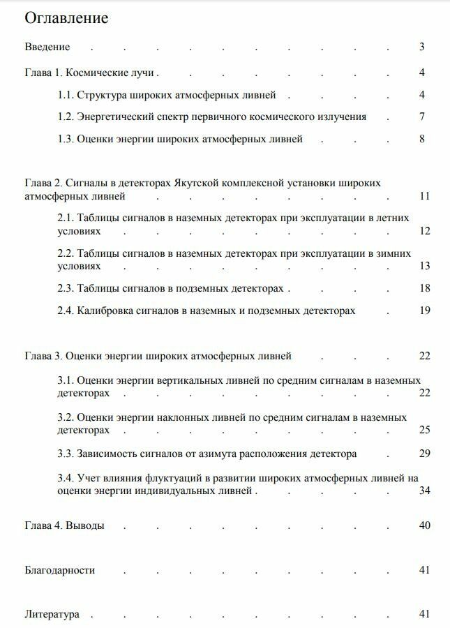 В 1966 г. К. Грейзен [1] и независимо Г.Т. Зацепин и В.А. Кузьмин [2] предсказали возможное «обрезание» (эффект ГЗК) спектра первичного космического излучения (ПКИ) при энергиях свыше ~3×1019 эВ. Интенсивность космических лучей (КЛ) в данной области спектра чрезвычайно мала. На площадь в 1 км2 частица ПКИ с энергией ~1020 эВ падает раз в сто лет. Для изучения энергетического спектра и состава частиц ПКИ по широким атмосферным ливням (ШАЛ) построены установки с огромной площадью: 3000 км 2 в Аргентине (установка Pierre Auger Observatory (PAO)) и 700 км2 в США (установка Telescope Array (TA)). Более 40 лет продолжает свою работу Якутская комплексная установка ШАЛ (ЯКУШАЛ). В настоящее время ее площадь составляет около 8 км2 . Последние полученные данные о спектре частиц ПКИ [3–5] могут быть интерпретированы как ГЗК обрезание. Однако возможны и другие варианты интерпретации данных экспериментов [6]. В данной дипломной работе рассмотрены методы получения оценок энергии ШАЛ по сигналам в наземных детекторах ЯКУШАЛ от частиц ливня. В главе 2 с помощью пакета GEANT4 [7] приведены результаты расчетов детальных таблиц сигналов в сцинтилляционных детекторах ЯКУШАЛ от γ-квантов, позитронов, электронов и мюонов. Таблицы получены для наземных детекторов, эксплуатируемых в летних (п.2.1) и зимних (п.2.2) условиях, а также для подземных детекторов, расположенных на глубине 2 м (п.2.3). Для наземных и подземных детекторов приведены результаты моделирования их калибровки по сигналам от одиночных атмосферных вертикальных мюонов (п.2.4). В главе 3 приведены оценки энергии вертикальных (п.3.1) и наклонных (п.3.2) ШАЛ, полученные по сигналам в наземных детекторах с использованием рассчитанных ранее таблиц и пакета CORSIKA [8]. В (п.3.3) изучена зависимость сигналов от азимута расположения детектора. В (п.3.4) приведены результаты влияния флуктуаций сигналов в наземных детекторах на оценки энергии индивидуальных ШАЛ. В Главе 4 приведены основные выводы по результатам данной дипломной работы.