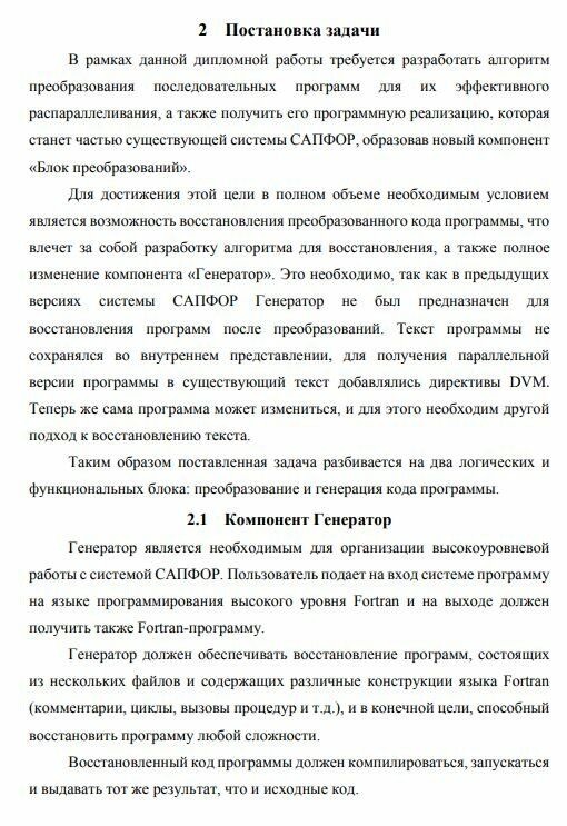 В рамках данной дипломной работы требуется разработать алгоритм преобразования последовательных программ для их эффективного распараллеливания, а также получить его программную реализацию, которая станет частью существующей системы САПФОР, образовав новый компонент «Блок преобразований». Для достижения этой цели в полном объеме необходимым условием является возможность восстановления преобразованного кода программы, что влечет за собой разработку алгоритма для восстановления, а также полное изменение компонента «Генератор». Это необходимо, так как в предыдущих версиях системы САПФОР Генератор не был предназначен для восстановления программ после преобразований. Текст программы не сохранялся во внутреннем представлении, для получения параллельной версии программы в существующий текст добавлялись директивы DVM. Теперь же сама программа может измениться, и для этого необходим другой подход к восстановлению текста. Таким образом поставленная задача разбивается на два логических и функциональных блока: преобразование и генерация кода программы.