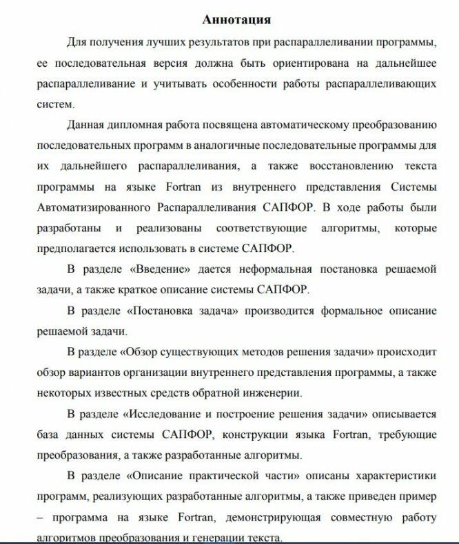 Для получения лучших результатов при распараллеливании программы, ее последовательная версия должна быть ориентирована на дальнейшее распараллеливание и учитывать особенности работы распараллеливающих систем. Данная дипломная работа посвящена автоматическому преобразованию последовательных программ в аналогичные последовательные программы для их дальнейшего распараллеливания, а также восстановлению текста программы на языке Fortran из внутреннего представления Системы Автоматизированного Распараллеливания САПФОР. В ходе работы были разработаны и реализованы соответствующие алгоритмы, которые предполагается использовать в системе САПФОР. В разделе «Введение» дается неформальная постановка решаемой задачи, а также краткое описание системы САПФОР. В разделе «Постановка задача» производится формальное описание решаемой задачи. В разделе «Обзор существующих методов решения задачи» происходит обзор вариантов организации внутреннего представления программы, а также некоторых известных средств обратной инженерии. В разделе «Исследование и построение решения задачи» описывается база данных системы САПФОР, конструкции языка Fortran, требующие преобразования, а также разработанные алгоритмы. В разделе «Описание практической части» описаны характеристики программ, реализующих разработанные алгоритмы, а также приведен пример – программа на языке Fortran, демонстрирующая совместную работу алгоритмов преобразования и генерации текста.