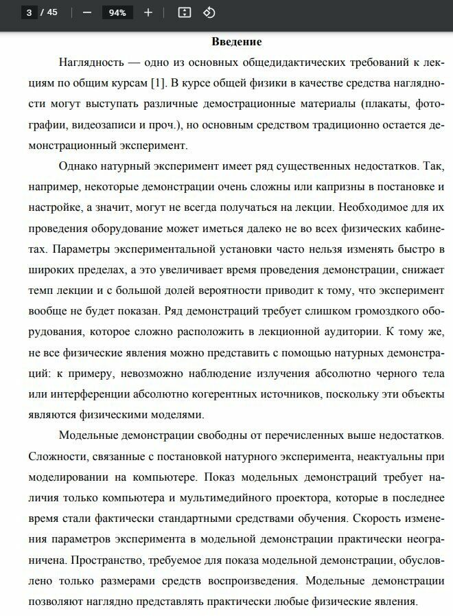 Наглядность — одно из основных общедидактических требований к лекциям по общим курсам [1]. В курсе общей физики в качестве средства наглядности могут выступать различные демострационные материалы (плакаты, фотографии, видеозаписи и проч.), но основным средством традиционно остается демонстрационный эксперимент. Однако натурный эксперимент имеет ряд существенных недостатков. Так, например, некоторые демонстрации очень сложны или капризны в постановке и настройке, а значит, могут не всегда получаться на лекции. Необходимое для их проведения оборудование может иметься далеко не во всех физических кабинетах. Параметры экспериментальной установки часто нельзя изменять быстро в широких пределах, а это увеличивает время проведения демонстрации, снижает темп лекции и с большой долей вероятности приводит к тому, что эксперимент вообще не будет показан. Ряд демонстраций требует слишком громоздкого оборудования, которое сложно расположить в лекционной аудитории. К тому же, не все физические явления можно представить с помощью натурных демонстраций: к примеру, невозможно наблюдение излучения абсолютно черного тела или интерференции абсолютно когерентных источников, поскольку эти объекты являются физическими моделями. Модельные демонстрации свободны от перечисленных выше недостатков. Сложности, связанные с постановкой натурного эксперимента, неактуальны при моделировании на компьютере. Показ модельных демонстраций требует наличия только компьютера и мультимедийного проектора, которые в последнее время стали фактически стандартными средствами обучения. Скорость изменения параметров эксперимента в модельной демонстрации практически неограничена. Пространство, требуемое для показа модельной демонстрации, обусловлено только размерами средств воспроизведения. Модельные демонстрации позволяют наглядно представлять практически любые физические явления.