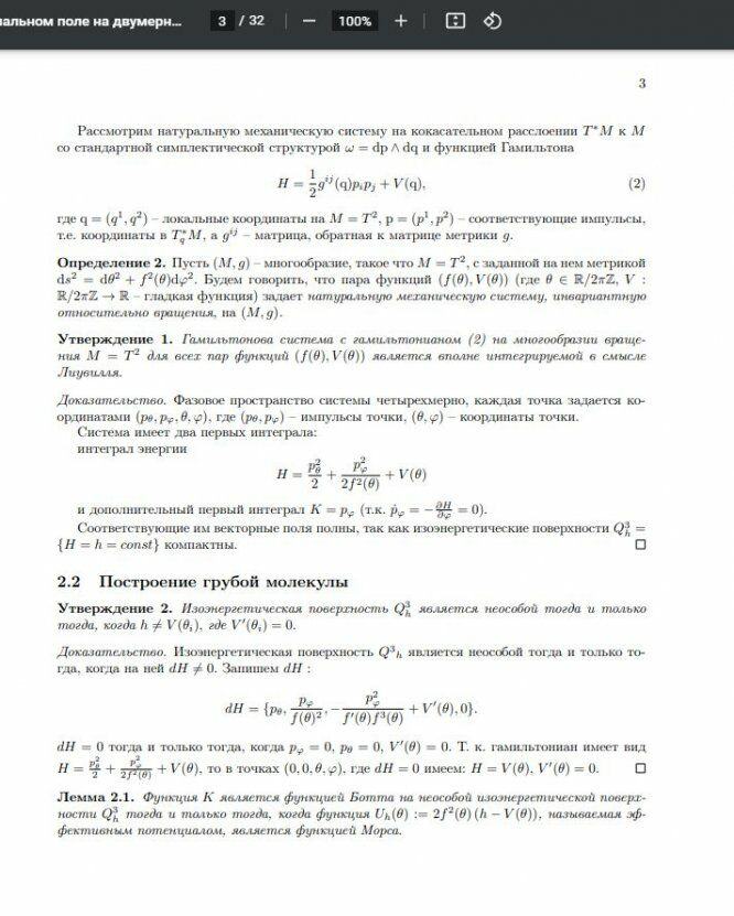 Рассмотрим натуральную механическую систему на кокасательном расслоении T ∗M к M со стандартной симплектической структурой ω = dp ∧ dq и функцией Гамильтона H = 1 2 g ij (q)pipj + V (q), (2) где q = (q 1 , q2 ) – локальные координаты на M = T 2 , p = (p 1 , p2 ) – соответствующие импульсы, т.е. координаты в T ∗ q M, а g ij – матрица, обратная к матрице метрики g. Определение 2. Пусть (M, g) – многообразие, такое что M = T 2 , с заданной на нем метрикой ds 2 = dθ 2 + f 2 (θ)dϕ 2 . Будем говорить, что пара функций (f(θ), V (θ)) (где θ ∈ R/2πZ, V : R/2πZ → R – гладкая функция) задает натуральную механическую систему, инвариантную относительно вращения, на (M, g). Утверждение 1. Гамильтонова система с гамильтонианом (2) на многообразии вращения M = T 2 для всех пар функций (f(θ), V (θ)) является вполне интегрируемой в смысле Лиувилля. Доказательство. Фазовое пространство системы четырехмерно, каждая точка задается координатами (pθ, pϕ, θ, ϕ), где (pθ, pϕ) – импульсы точки, (θ, ϕ) – координаты точки. Система имеет два первых интеграла: интеграл энергии H = p 2 θ 2 + p 2 ϕ 2f 2(θ) + V (θ) и дополнительный первый интеграл K = pϕ (т.к. p˙ϕ = − ∂H ∂ϕ = 0). Соответствующие им векторные поля полны, так как изоэнергетические поверхности Q3 h = {H = h = const} компактны. 2.2 Построение грубой молекулы Утверждение 2. Изоэнергетическая поверхность Q3 h является неособой тогда и только тогда, когда h 6= V (θi), где V 0 (θi) = 0. Доказательство. Изоэнергетическая поверхность Q3 h является неособой тогда и только тогда, когда на ней dH 6= 0. Запишем dH : dH = {pθ, pϕ f(θ) 2 , − p 2 ϕ f 0(θ)f 3(θ) + V 0 (θ), 0}. dH = 0 тогда и только тогда, когда pϕ = 0, pθ = 0, V 0 (θ) = 0. Т. к. гамильтониан имеет вид H = p 2 θ 2 + p 2 ϕ 2f 2(θ) + V (θ), то в точках (0, 0, θ, ϕ), где dH = 0 имеем: H = V (θ), V 0 (θ) = 0. Лемма 2.1. Функция K является функцией Ботта на неособой изоэнергетической поверхности Q3 h тогда и только тогда, когда функция Uh(θ) := 2f 2 (θ) (h − V (θ)), называемая эффективным потенциалом, является функцией Морса.