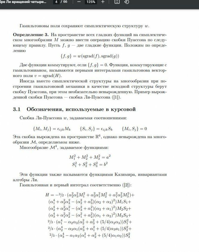 Гамильтоновы поля сохраняют симплектическую структуру w. Определение 3. На пространстве всех гладких функций на симплектическом многообразии M можно ввести операцию скобки Пуассона по следующему правилу. Пусть f, g — две гладкие функции. Положим по определению {f, g} = w(sgrad(f),sgrad(g)) Две функции коммутируют, если {f, g} = 0. Функции, коммутирующие с гамильтонианом, называются первыми интегралами гамильтонова векторного поля v = sgrad(H). Иногда вместо симплектической структуры на многообразии при построении гамильтоновой механики в качестве исходной структуры берут скобку Пуассона, при этом необязательно невырожденную. Пример вырожденной скобки Пуассона — скобка Ли-Пуассона ([1]). 3.1 Обозначения, используемые в курсовой