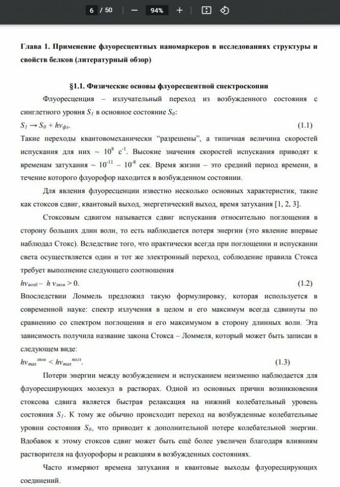 Флуоресценция – излучательный переход из возбужденного состояния с синглетного уровня S1 в основное состояние S0: S1 → S0 + hνфл. (1.1) Такие переходы квантовомеханически “разрешены”, а типичная величина скоростей испускания для них ~ 108 с -1 . Высокие значения скоростей испускания приводят к временам затухания ~ 10-11 – 10-8 сек. Время жизни – это средний период времени, в течение которого флуорофор находится в возбужденном состоянии. Для явления флуоресценции известно несколько основных характеристик, такие как стоксов сдвиг, квантовый выход, энергетический выход, время затухания [1, 2, 3]. Стоксовым сдвигом называется сдвиг испускания относительно поглощения в сторону больших длин волн, то есть наблюдается потеря энергии (это явление впервые наблюдал Стокс). Вследствие того, что практически всегда при поглощении и испускании света осуществляется один и тот же электронный переход, соблюдение правила Стокса требует выполнение следующего соотношения hνвозб – h νлюм > 0. (1.2) Впоследствии Ломмель предложил такую формулировку, которая используется в современной науке: спектр излучения в целом и его максимум всегда сдвинуты по сравнению со спектром поглощения и его максимумом в сторону длинных волн. Эта зависимость получила название закона Стокса – Ломмеля, который может быть записан в следующем виде: hνmaxлюм < hνmaxпогл. (1.3) Потери энергии между возбуждением и испусканием неизменно наблюдается для флуоресцирующих молекул в растворах. Одной из основных причин возникновения стоксова сдвига является быстрая релаксация на нижний колебательный уровень состояния S1. К тому же обычно происходит переход на возбужденные колебательные уровни состояния S0, что приводит к дополнительной потере колебательной энергии. Вдобавок к этому стоксов сдвиг может быть ещё более увеличен благодаря влияниям растворителя на флуорофоры и реакциям в возбужденных состояниях. Часто измеряют времена затухания и квантовые выходы флуоресцирующих соединений.