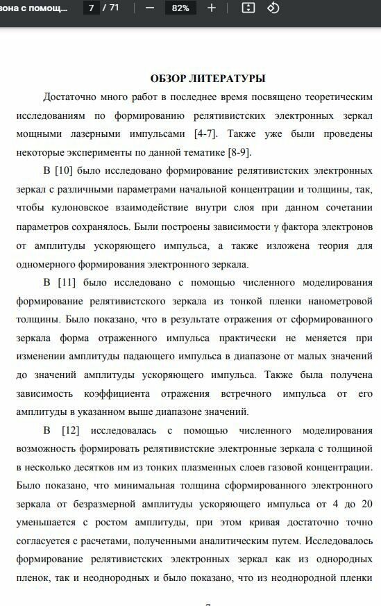 Достаточно много работ в последнее время посвящено теоретическим исследованиям по формированию релятивистских электронных зеркал мощными лазерными импульсами [4-7]. Также уже были проведены некоторые эксперименты по данной тематике [8-9]. В [10] было исследовано формирование релятивистских электронных зеркал с различными параметрами начальной концентрации и толщины, так, чтобы кулоновское взаимодействие внутри слоя при данном сочетании параметров сохранялось. Были построены зависимости  фактора электронов от амплитуды ускоряющего импульса, а также изложена теория для одномерного формирования электронного зеркала. В [11] было исследовано с помощью численного моделирования формирование релятивистского зеркала из тонкой пленки нанометровой толщины. Было показано, что в результате отражения от сформированного зеркала форма отраженного импульса практически не меняется при изменении амплитуды падающего импульса в диапазоне от малых значений до значений амплитуды ускоряющего импульса. Также была получена зависимость коэффициента отражения встречного импульса от его амплитуды в указанном выше диапазоне значений. В [12] исследовалась с помощью численного моделирования возможность формировать релятивистские электронные зеркала с толщиной в несколько десятков нм из тонких плазменных слоев газовой концентрации. Было показано, что минимальная толщина сформированного электронного зеркала от безразмерной амплитуды ускоряющего импульса от 4 до 20 уменьшается с ростом амплитуды, при этом кривая достаточно точно согласуется с расчетами, полученными аналитическим путем. Исследовалось формирование релятивистских электронных зеркал как из однородных пленок, так и неоднородных и было показано, что из неоднородной пленки