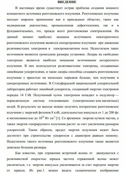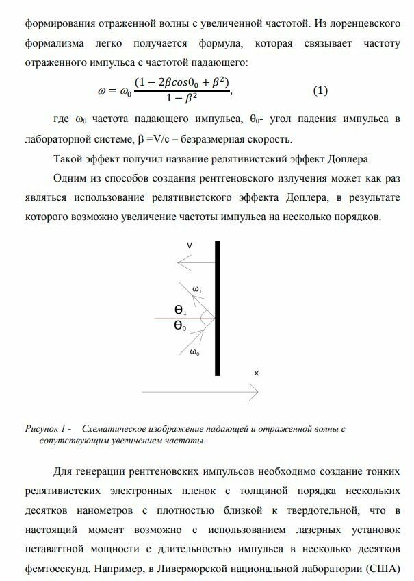 формирования отраженной волны с увеличенной частотой. Из лоренцевского формализма легко получается формула, которая связывает частоту отраженного импульса с частотой падающего: где 0 частота падающего импульса, 0- угол падения импульса в лабораторной системе,  =V/c – безразмерная скорость. Такой эффект получил название релятивистский эффект Доплера. Одним из способов создания рентгеновского излучения может как раз являться использование релятивистского эффекта Доплера, в результате которого возможно увеличение частоты импульса на несколько порядков. Рисунок 1 - Схематическое изображение падающей и отраженной волны с сопутствующим увеличением частоты. Для генерации рентгеновских импульсов необходимо создание тонких релятивистских электронных пленок с толщиной порядка нескольких десятков нанометров с плотностью близкой к твердотельной, что в настоящий момент возможно с использованием лазерных установок петаваттной мощности с длительностью импульса в несколько десятков фемтосекунд. Например, в Ливерморской национальной лаборатории (США) лазерная установка позволяет создавать импульсы с длительностью 440 фс и мощностью до 1ПВт [2]. Известно также, что сейчас активно используются тонкие графеновые пленки, толщина которых может достигать монослоя углерода [3]. При нормальном падении такого импульса на тонкую плазменную пленку электроны могут быть практически полностью вытеснены из нее в направлении распространения импульса. При этом электроны достигают релятивистских скоростей, за время, намного меньшее, чем период лазерного поля. Диаметр сгенерированных релятивистских электронных пленок может составлять порядка нескольких десятков микрон, что намного больше их толщины. Таким образом, сгенерированные релятивистские электронные пленки можно рассматривать как электронные зеркала.