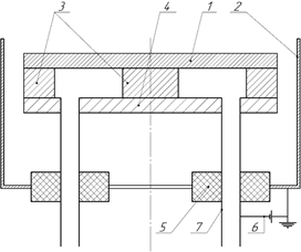 1 —катод—мишень, 2 — стенки камеры, 3 — магнитная система, 4 — магнитопровод, 5 — изолятор, 6 — источник питания, 7 — подвод воды