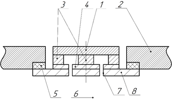1 —катод—мишень, 2 — стенки камеры, 3 — магнитная система, 4 — магнитопровод, 5 — изолятор, 6 — источник питания, 7 — подвод воды, 8 — фланец