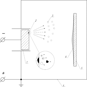 Основным узлом напылительных вакуумно-дуговых установок является ВДИ. На рисунке 1 представлена схема вакуумно-дуговой установки. 1 – катод; 2 – катодное пятно; 3 – продукты эрозии; 4 – анод – вакуумная камера; 5 – подложка; 6 – образующиеся покрытие