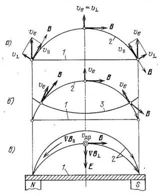В МРС горит разряд в неоднородных скрещенных электрических и магнитных полях локализованный у поверхности распыляемой мишени (катода). Локализацию плазмы у поверхности катода можно объяснить арочным расположением магнитного поля над поверхностью катода. Локализация плазмы происходит в результате магнитной фокусировки электронов в ловушке (рисунок 1.1). Рабочие значения индукции магнитного поля для эффективного зажигания магнетронного разряда, а также для его дальнейшего поддержания лежат в пределах 300-1500 Гаусс, которые приходятся в зону максимальной выработки мишени под аркой магнитного поля. Рисунок 1.1 — Фокусирующее действие магнитного (а) и электрического (б) полей на электроны и возникновение дрейфовых движений электронов (в) [2]