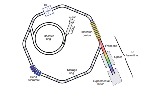 1. Источник электронов (обычно генерируемых термоэлектронной эмиссией от горячей нити накала) в электронной пушке. Электроны ускоряются с помощью линейного ускорителя (LINAC) примерно до 100 МэВ. Требуется регулярная подача электронов, так как они всегда рассеиваются из-за столкновений с частицами остаточного газа в накопительном кольце.