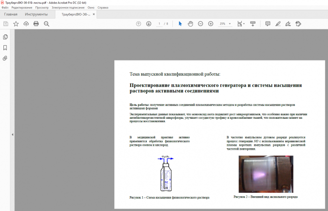 ВКР / Дипломная работа (Э-8) на тему "Проектирование плазмохимического генератора и системы насыщения растворов активными соединениями"