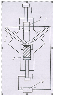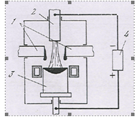 1-Электрод. 2-Плазматрон. 3-Слиток. 4-Источник тока.