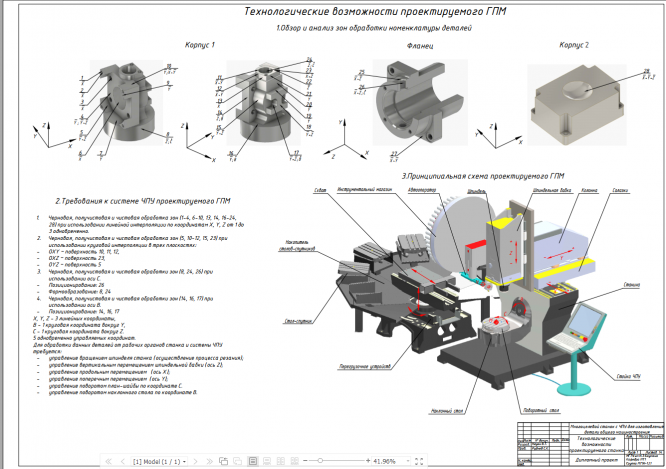 Объектом проектирования является ГПМ построенный на базе многоцелевого 5-х координатного станка с ЧПУ для обработки корпусных деталей размеров 400х300х300 мм по 7 квалитету точности с шероховатости 1,25, имеющих сложные поверхности, требующих проведения линейной интерполяции по 3-м координатам X, Y, Z и круговой интерполяции по 2-м координатам Y, Z.