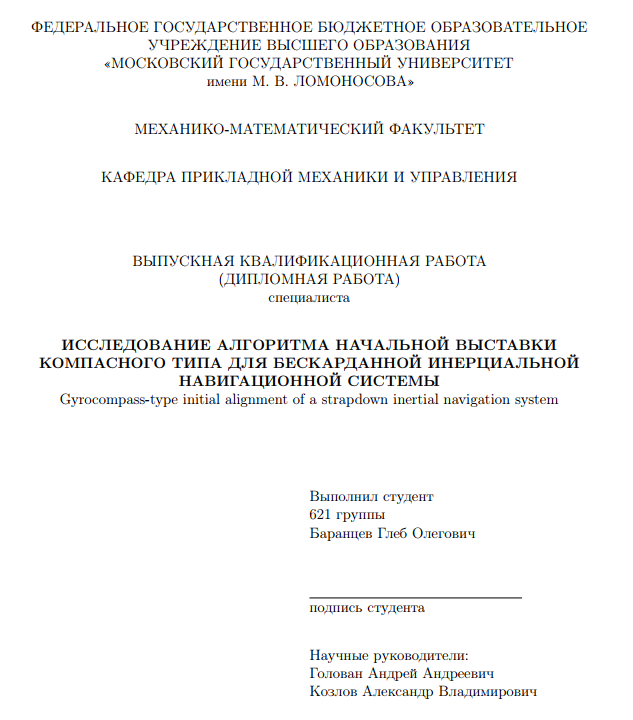 Главная » Учебные материалы » Дипломы и ВКР » Выпускные квалификационные работы (ВКР) » МГУ им. Ломоносова » Несколько классов/семестров » Исследование алгоритма начальной выставки компасного типа для бескарданной инерциальной навигационной системы