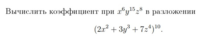 Вычислить коэффициент при x6y15z8 в разложении (2x2+3y3+7z4)10