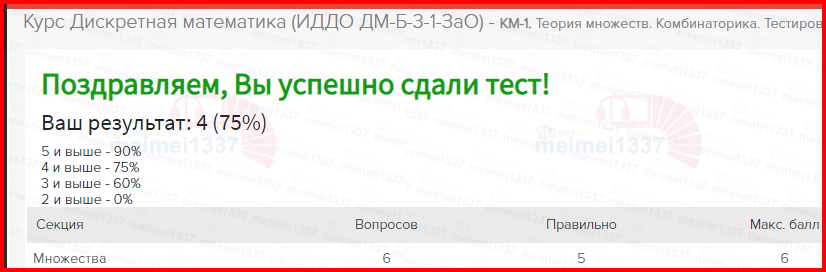 Для студентов ИДДО НИУ «МЭИ» по предмету Дискретная математикаКМ-1. Теория множеств. Комбинаторика. Тестирование - 75%КМ-1. Теория множеств. Комбинаторика. Тестирование - 75%