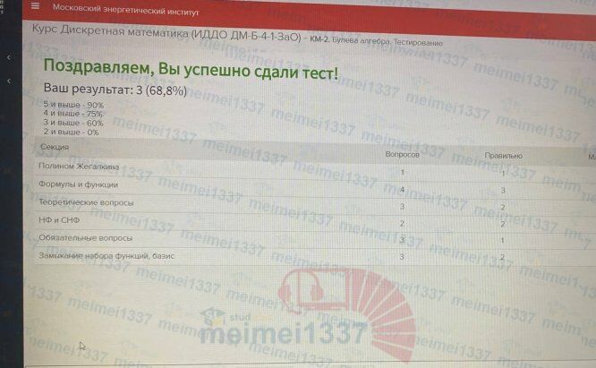 Для студентов ИДДО НИУ «МЭИ» по предмету Дискретная математикаКМ-2. Булева алгебра. Тестирование - 68.8%-КМ-2. Булева алгебра. Тестирование - 68.8%-