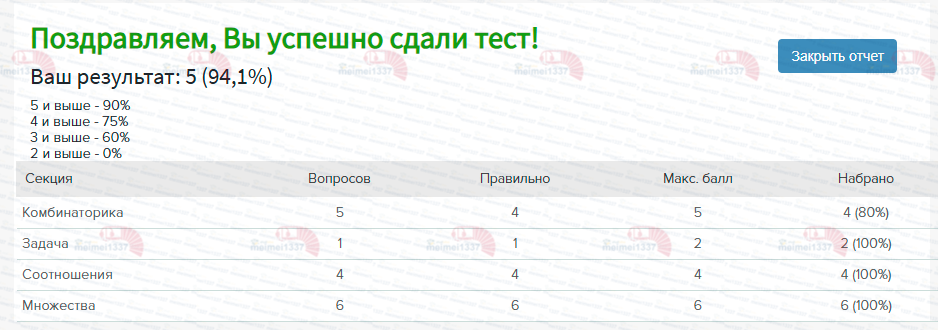 Для студентов ИДДО НИУ «МЭИ» по предмету Дискретная математикаКМ-1. Теория множеств. Комбинаторика. Тестирование - 94.1%КМ-1. Теория множеств. Комбинаторика. Тестирование - 94.1%