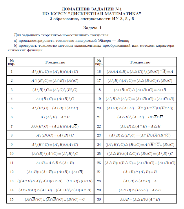 Для студентов МГТУ им. Н.Э.Баумана по предмету Дискретная математикаТиповое домашнее задание по дискретной математике (задача 1-2) за 3 семестр 15 вариантТиповое домашнее задание по дискретной математике (задача 1-2) за 3 семестр 15 вариант