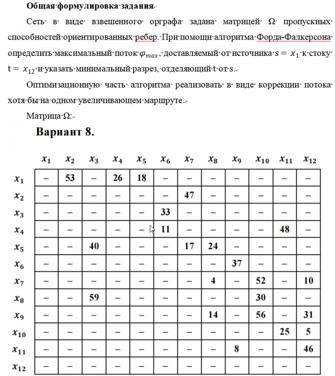 Для студентов МГТУ им. Н.Э.Баумана по предмету Дискретная математикаДЗ Поток в транспортной сети. Алгоритм Форда-Фалкерсона Вариант 8ДЗ Поток в транспортной сети. Алгоритм Форда-Фалкерсона Вариант 8