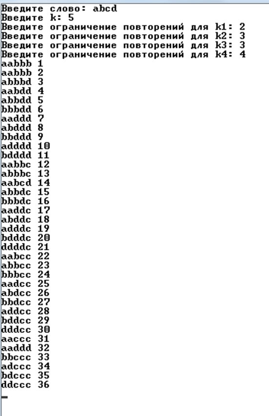 - Для множества B ={a, b, c, d}, k=5, k1 =2, k2 =3, k3 =3, k4=4- перечислить сочетания с повторениями по 5 элементов, в которых элемент a может встречаться не более 2 раз, элемент b – не более 3 раз, элемент c – не более 3 раз, элемент e – не более 4 раз.