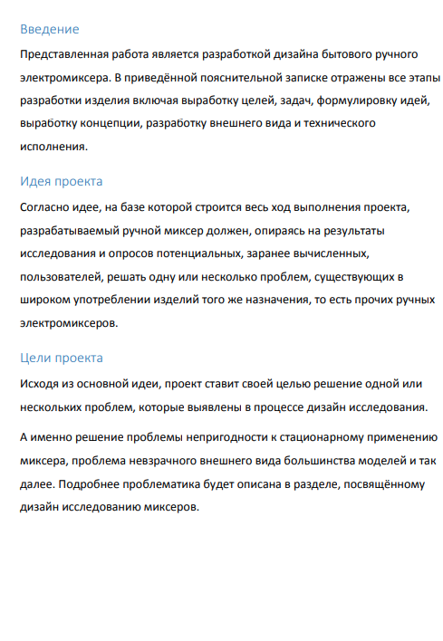 Представленная работа является разработкой дизайна бытового ручного электромиксера. В приведённой пояснительной записке отражены все этапы разработки изделия включая выработку целей, задач, формулировку идей, выработку концепции, разработку внешнего вида и технического исполнения.