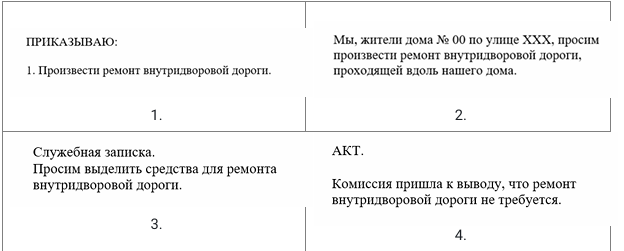 Для обеспечения оперативного поиска документов в шкафу дела располагаются в вертикальном положении корешками наружу в соответствии с номенклатурой дел Документы, находясь на оперативном хранении, не могут выдаваться работникам организации или сторонним организациям для текущей работы. На дверце шкафа с внутренней стороны необходимо прикрепить перечень хранящихся в нем дел. На какой из представленных картинок изображен фрагмент акта о выдаче дел во временное пользование Вы секретарь Управляющей компании. Вам необходимо сформулировать заголовок дела, в котором будут храниться следующие документы, поступившие от граждан: Предложение о благоустройстве территории Жалоба о некачественной работе дворников Заявление на замену бордюра Просьба о ремонте детской площадки и т.п.