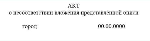 Но по факту конверт был вскрыт и в нем находится только один документ. Составьте акт о несоответствии вложения представленной описи.