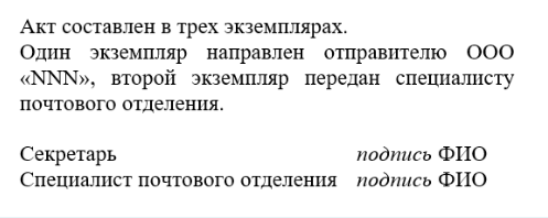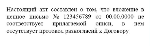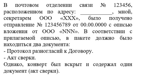 В соответствии с прилагаемой описью, в пакете должно было находиться два документа: - Протокол разногласий к Договору. - Акт сверки. Однако, конверт был вскрыт и содержал один документ (акт сверки). Настоящий акт составлен о том, что вложение в ценное письмо № 123456789 от 00.00.0000 не соответствует прилагаемой описи, в нем отсутствует протокол разногласий к Договору Акт составлен в трех экземплярах. Один экземпляр направлен отправителю ООО «NNN», второй экземпляр передан специалисту почтового отделения. Секретарь подпись ФИО Специалист почтового отделения подпись ФИО.