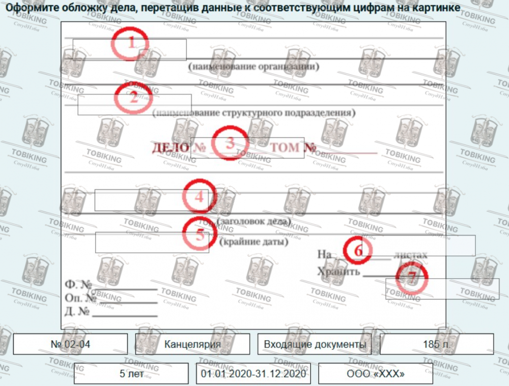 Оформите обложку дела, перетащив данные к соответствующим цифрам на картинке