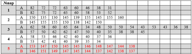 1. Для увеличения выхода целевого продукта используются два различных катализатора А и В. Фиксировался выход целевого продукта в n1 экспериментах при использовании катализатора А и в n2 экспериментах при использовании катализатора В ( таблице 1). Выяснить, существует ли разница в выходе целевого продукта при уровне значимости α (для чётных вариантов принять α=0,05, для нечётных α=0,01) или различия случайны.
