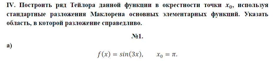 IV. Построить ряд Тейлора данной функции в окрестности точки x0, используя стандартные разложения Маклорена основных элементарных функций. Указать область, в которой разложение справедливо.