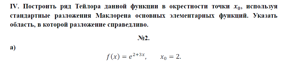 IV. Построить ряд Тейлора данной функции в окрестности точки , используя стандартные разложения Маклорена основных элементарных функций. Указать область, в которой разложение справедливо.