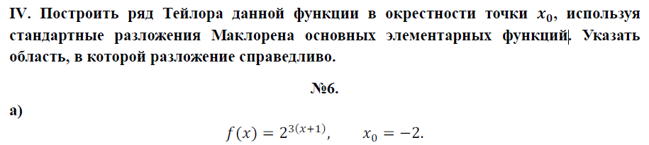 Для студентов НИУ ИТМО по предмету Дополнительные главы высшей математикиПостроить ряд Тейлора данной функции в окрестности точки, используя стандартные разложения Маклорена основных элементарных функцийПостроить ряд Тейлора данной функции в окрестности точки, используя стандартные разложения Маклорена основных элементарных функций