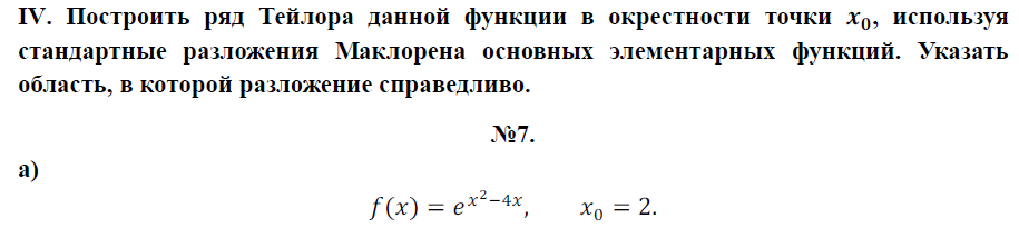 Для студентов НИУ ИТМО по предмету Дополнительные главы высшей математикиПостроить ряд Тейлора данной функции в окрестности точки, используя стандартные разложения Маклорена основных элементарных функцийПостроить ряд Тейлора данной функции в окрестности точки, используя стандартные разложения Маклорена основных элементарных функций