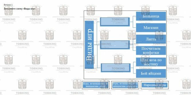 Заполните схему «Виды игр» Больница Игры, возникающие по инициативе детей Магазин Виды игр Игры, возникающие по инициативе взрослого Лапта Посчитаем конфетки Шла коза по мостику Народные игры Бой яйцами Соотнесите виды детской деятельности и практический опыт, который приобретает ребенок: Позволяет ребенку с помощью элементарного труда в процессе создания продуктов детского творчества на основе воображения и фантазии «вжиться» в мир взрослых, познать его и принять в нем участие Дает возможность формировать сложные мыслительные действия, творческое воображение, механизмы управления собственным поведением Активизирует самостоятельную деятельность ребенка, обеспечивает объединение и интеграцию разных видов деятельности Дает возможность ребенку самостоятельно находить решение, подтверждение или опровержение собственных представлений Объединяет взрослого и ребенка, удовлетворяет разнообразные потребности ребенка в эмоциональной близости со взрослым, в его поддержке и оценке Обогащает опыт ребенка, стимулирует развитие познавательных интересов, рождает и закрепляет социальные чувства Дает ребенку почувствовать себя равноправным членом общества.