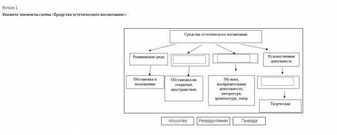 Укажите элементы схемы «Средства эстетического воспитания»: деятельность детей обеспечивает их...развитие, способность различать цвет, форму, звуки, подводит к более глубокому восприятию богатства красок, линий и их сочетаний, обеспечивает понимание языка различных видов Эстетическое действительности может успешно осуществляться при условии, что...входит в деятельность личности или коллектива как творческая...задача. Определите соответствие терминов и их определений Понятия: Художественно-эстетическое воспитание Художественно-эстетическое развитие Художественно-эстетическое восприятие Художественно-эстетическое образование Определения: Целенаправленный, систематический процесс воздействия на личность ребенка с целью развития у него способности видеть красоту окружающего мира, искусства и создавать ее. Процесс развития предпосылок ценностно-смыслового понимания и восприятия произведений искусства, формирование эстетического отношения к окружающему миру и элементарных представлений о видах искусства, реализацию собственного творческого потенциала.