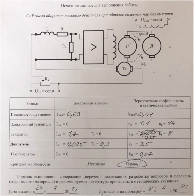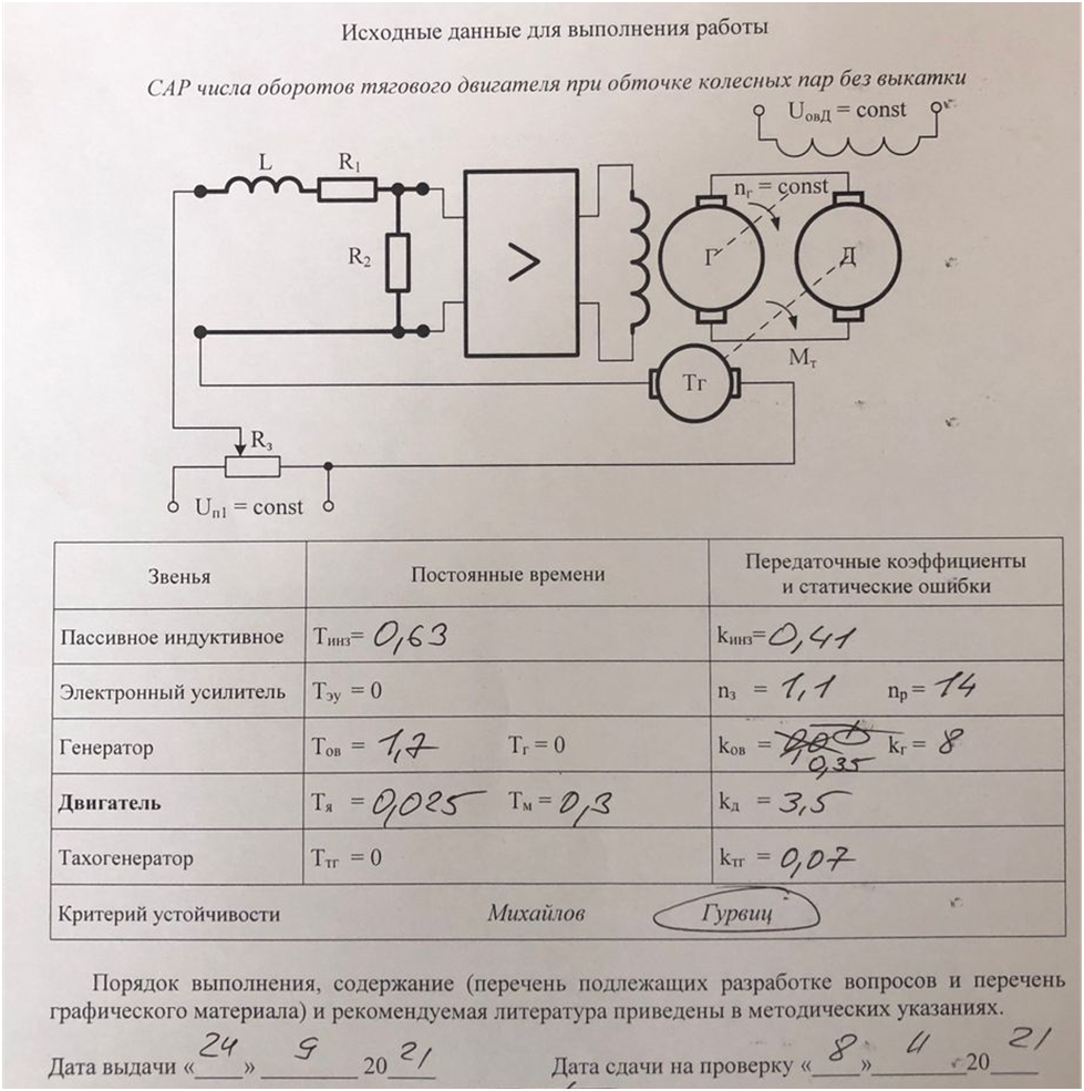 Цель курсового проекта - исследование линейной САР. В качестве примера, будет проверена САР числа оборотов тягового двигателя при обточке колесных пар без выкатки. Основными задачами курсового проекта есть: понимание, как работает принципиальная схема, расчет коэффициентов САР, составление передаточных функций динамических звеньев, построение частотных характеристик звеньев и амплитудно-частотных характеристик; получение дифференциальных уравнений, описывающих поведение всей САР; оценка устойчивости САР по теореме Гурвица, определение устойчивости методом Д-разбиение, сделать вывод о качестве системы.