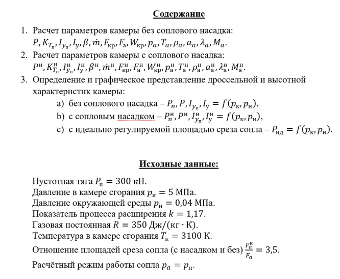 Для студентов МГТУ им. Н.Э.Баумана по предмету Двигательные установкиГазодинамический расчет основных параметров и характеристик идеальной камеры ракетного двигателя на расчетном режиме работы соплаГазодинамический расчет основных параметров и характеристик идеальной камеры ракетного двигателя на расчетном режиме работы сопла