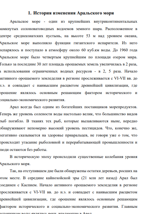 В данной работе затронута ставшая на сегодняшний день очень актуальной, проблема взаимодействия человека с природой. На примере Аральского моря подтверждено, что современная хозяйственная деятельность человека приводит к значительным изменениям окружающей среды. Проблема Аральского моря вызывает постоянный интерес мирового научного сообщества. Изучение современного состояния Арала имеет как прикладное, так и фундаментальное научное значение. С одной стороны, состояние Аральского моря оказывает решающее воздействие на природные особенности окружающих территорий, социально-экономические условия в регионе, здоровье местного населения и структуру хозяйства. С другой стороны, значение экологического кризиса Аральского моря не 4 ограничивается только региональными и прикладными аспектами. Современный Арал представляет собой своего рода «природную лабораторию», в которой может изучаться отклик физических, химических и биологических систем крупного внутреннего водоема аридной зоны на экстремальное антропогенное вмешательство. Результаты наблюдений и исследований в данной области могут быть применены, в том числе, для предотвращения возникновения и смягчения последствий подобных экологических кризисов в других районах земного шара.