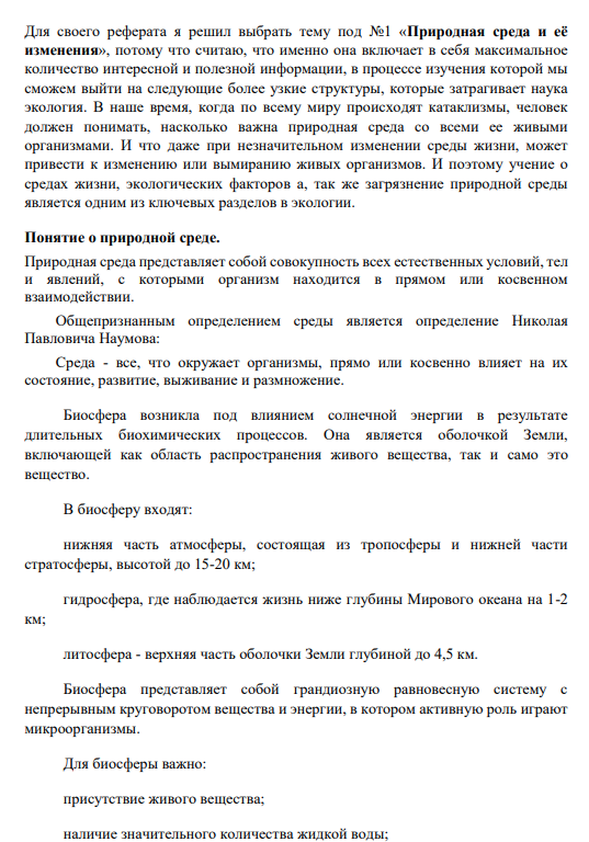 Для своего реферата я решил выбрать тему под №1 «Природная среда и её изменения», потому что считаю, что именно она включает в себя максимальное количество интересной и полезной информации, в процессе изучения которой мы сможем выйти на следующие более узкие структуры, которые затрагивает наука экология. В наше время, когда по всему миру происходят катаклизмы, человек должен понимать, насколько важна природная среда со всеми ее живыми организмами. И что даже при незначительном изменении среды жизни, может привести к изменению или вымиранию живых организмов. И поэтому учение о средах жизни, экологических факторов а, так же загрязнение природной среды является одним из ключевых разделов в экологии.